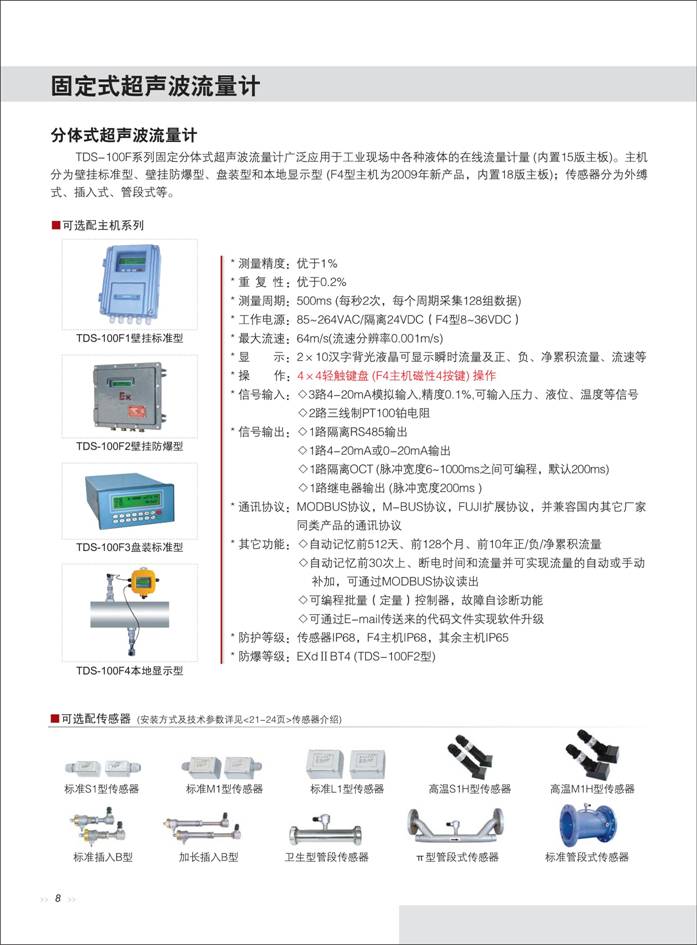 超聲波流量計(jì) 一、概 述 AK-TDS-100F型固定式超聲波流量計(jì)利用了低電壓、多脈沖時(shí)差原理,采用高精度和超穩(wěn)定的雙平衡信號(hào)差分發(fā)射、差分接收數(shù)字檢測技術(shù)來測量順流和逆流方向的聲波傳輸時(shí)
